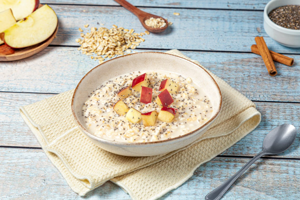 La avena aporta energía de liberación lenta, lo que permite iniciar el día sin sensación de hambre temprana. Al combinarse con la manzana, se incrementa el aporte de fibra dietética, favoreciendo el tránsito intestinal y prolongando la sensación de saciedad.