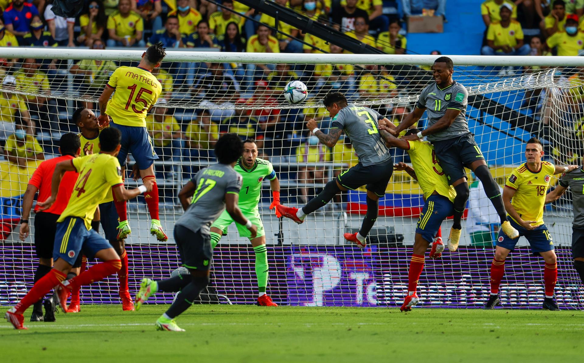 El arquero colombiano Ospina sacó de raya un cabezazo de Hincapié que tenía destino de gol. Luego el mismo portero sacó otra opción clara de Ecuador.